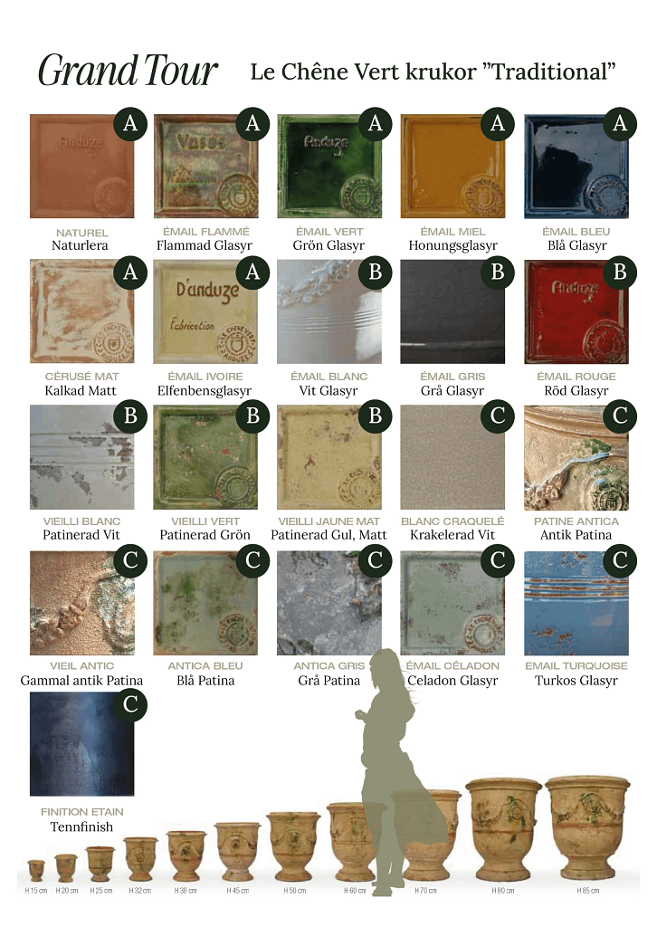 Le Chêne Verts krukor tillverkas endast på beställning – en i taget, för hand, i en tradition som sträcker sig över fyra sekler. Genom vårt samarbete får du möjligheten att träda in i en ytterst förnämlig skara av kö-kollegor: kungligheter, världsledande trädgårdsdesigners och 6-stjärniga hotell.